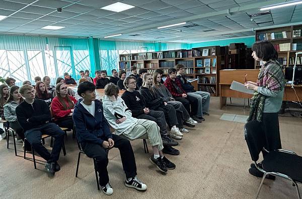 С лекцией для студентов выступила гостья из библиотеки им. А. С. Пушкина. Она рассказала о трагических страницах истории, о мужестве и стойкости нашего народа, о том, как важно помнить и чтить память невинных жертв.