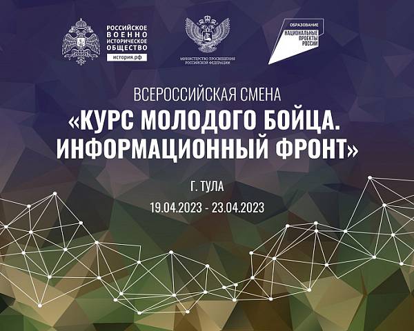 Всероссийская смена «Курс молодого бойца. Информационный фронт» –уникальная смена, организованная Российским военно-историческим обществом, призванная объединить молодых людей в возрасте от 18 до 30 лет, которые занимаются созданием просветительского информационного контента в сети «Интернет».