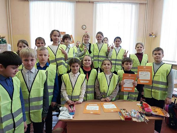 Каждый ученик получил в подарок световозвращающие мешки, жилеты и рабочие тетради с полезными упражнениями.