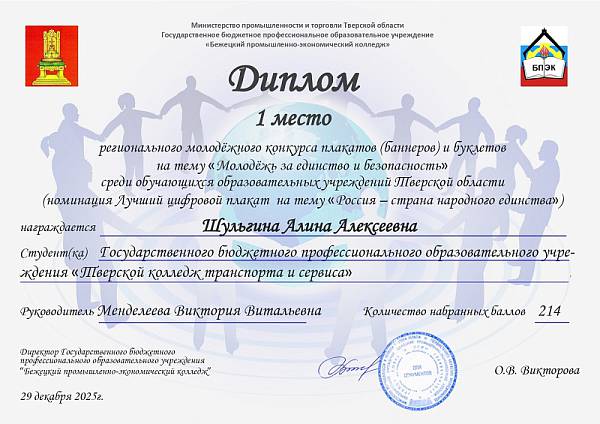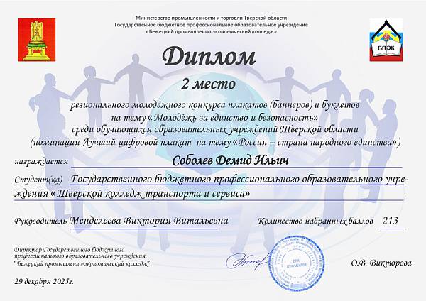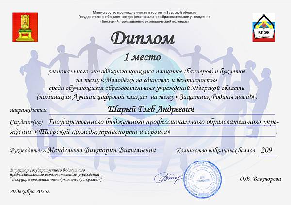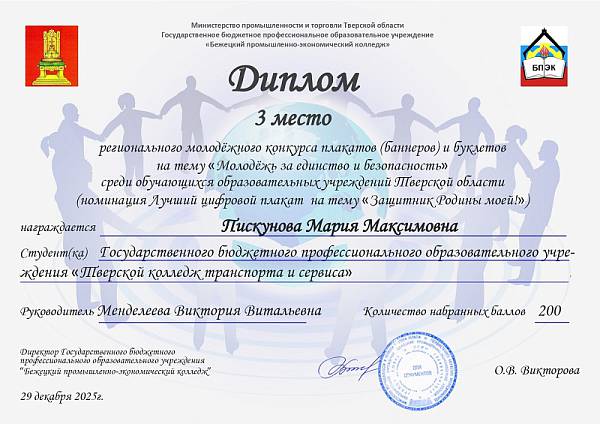 Студенты профессии "Графический дизайнер" приняли участие в региональном молодёжном конкурсе плакатов (баннеров) и буклетов на тему "Молодёжь за единство и безопасность" среди обучающихся образовательных учреждений Тверской области, организованном Бежецким промышленно-экономическим колледжем.
