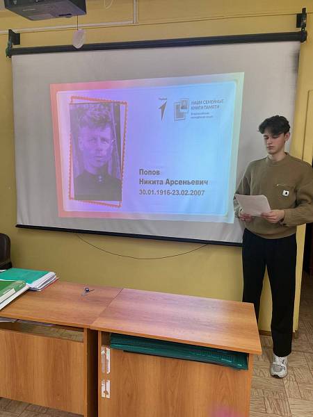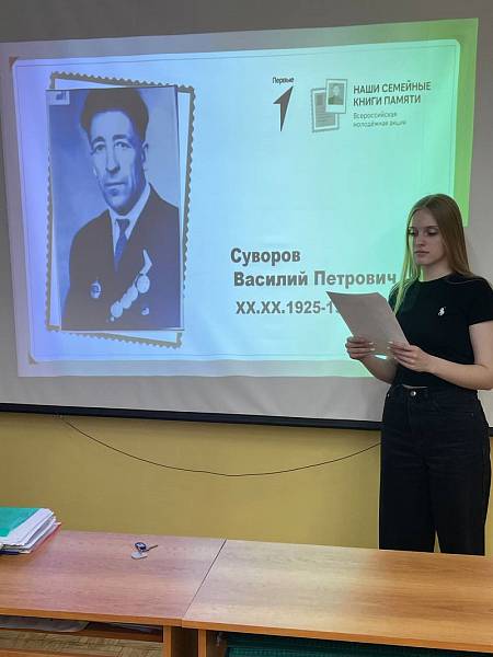 25 апреля студенты колледжа приняли участие во Всероссийской молодежной акции «Наши семейные книги памяти» в рамках мероприятий, посвященных Году защитника Отечества и 80-летию Великой Победы. Участники акции изучили семейные архивы, побеседовали с родителями, бабушками и дедушками для уточнения фактов участия родственников в Великой Отечественной войне и подготовили публичное выступление с рассказом о своих родственниках, принимавших участие в войне, их судьбе и подвигах.