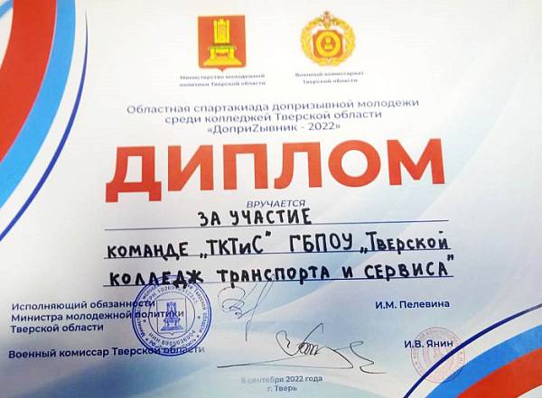 8 сентября 2022 года команда студентов нашего колледжа приняла участие в областной Спартакиаде «Допризывник – 2022». Организаторами Спартакиады выступили Министерство молодежной политики Тверской области и Военный комиссариат Тверской области.
