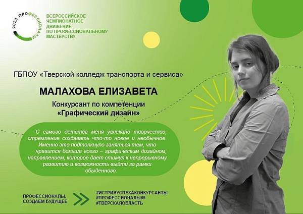 По традиции Чемпионата представляем участника компетенции "Графический дизайн", студентку группы 3ГД2 ГБПОУ "Тверской колледж транспорта и сервиса" Малахову Елизавету.