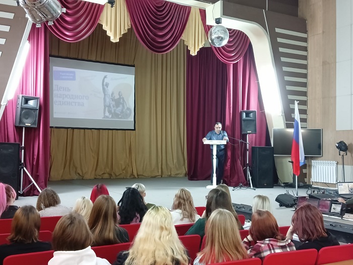 Очередное занятие из цикла «Разговоры о важном», проведенное 31 октября 2022 года, было посвящено приближающемуся празднику - Дню народного единства - и называлось «Мы едины, мы – одна страна!». На занятии студенты вспомнили историю нашей страны и те события, которые легли в основу государственного праздника – «День народного единства», поговорили о том, что единство и сплоченность народов страны помогает защищать ее от врага. Но защита Родины – не просто слова: в тяжелые годы, когда враг пытался причинить боль и страдания нашему народу, люди вставали на защиту своего Отечества. Студенты пришли к выводу, что сплоченность народа в период разного рода трудностей является залогом победы.