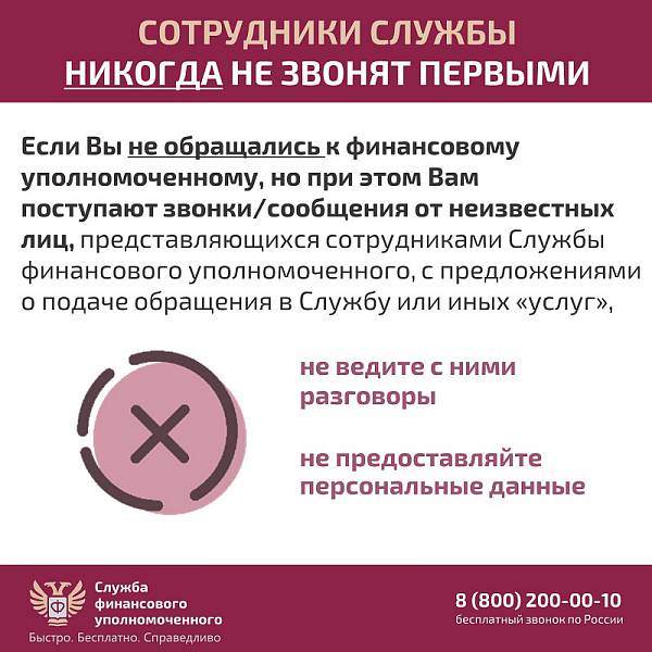 В случае, если вы не обращались к финансовому уполномоченному, но при этом вам поступают звонки и сообщения от неизвестных лиц, представляющихся сотрудниками Службы финансового уполномоченного (или АНО «СОДФУ», или помощниками финансового уполномоченного, или финансовыми уполномоченными), не ведите с ними разговоры и не предоставляйте какие-либо персональные данные! Сотрудники Службы финансового уполномоченного никогда не звонят первыми с предложениями о подаче обращения финансовому уполномоченному, а также с предложением иных «услуг».