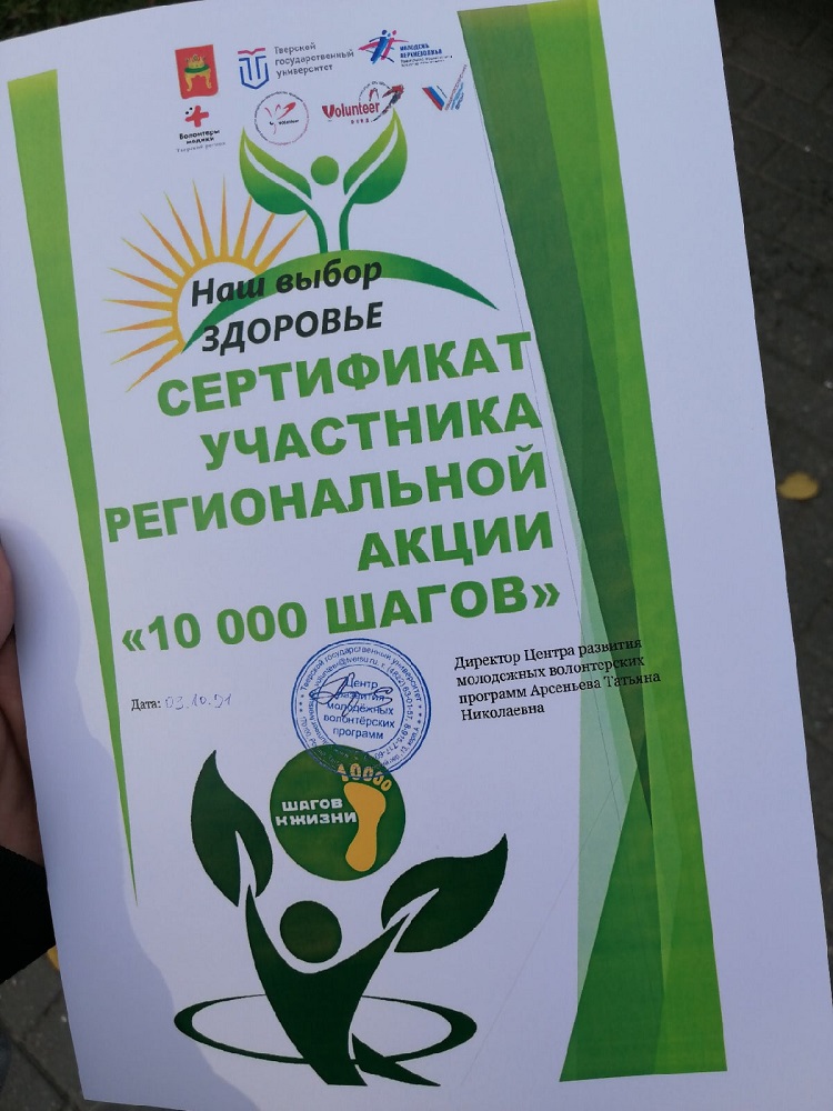 3 октября 2021 года студенты колледжа приняли участие в оздоровительной акции «10 тысяч шагов к жизни». Акция, которая входит в программу федерального проекта «Здоровый муниципалитет», прошла одновременно в нескольких городах Тверской области, и в этом году была приурочена ко Всемирному дню сердца, поэтому её девиз – «Сердце для жизни». Также акция была посвящена Дню учителя.
