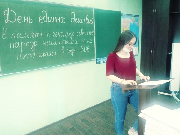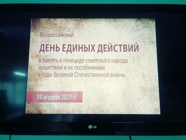 С 19 по 21 апреля 2021 года наш колледж присоединился ко Всероссийской акции «День единых действий», проводимой в память о геноциде советского народа нацистами и их пособниками в годы Великов Отечественной войны. Основной целью проведения Дня единых действий является сохранение исторической правды о преступлениях нацистов и их пособников в отношении мирных советских граждан в годы ВОВ на оккупированной территории. В рамках мероприятия в колледже прошел единый урок, посвященный памяти жертв геноцида Советского народа от немецко-фашистских захватчиков в годы ВОВ с просмотром видеофильма «Без срока давности», изготовленного Министерством просвещения РФ.
