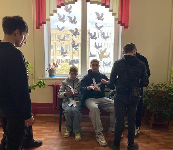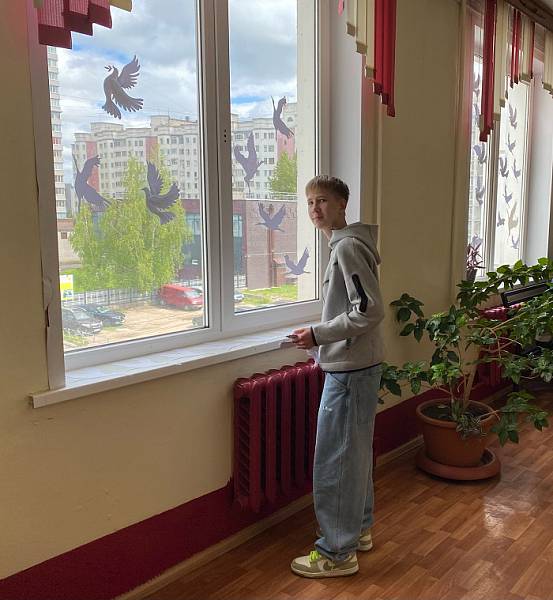 Ребята украсили фасад учебного заведения бумажными журавлями и рисунками с символикой победы, почтив память ветеранов.