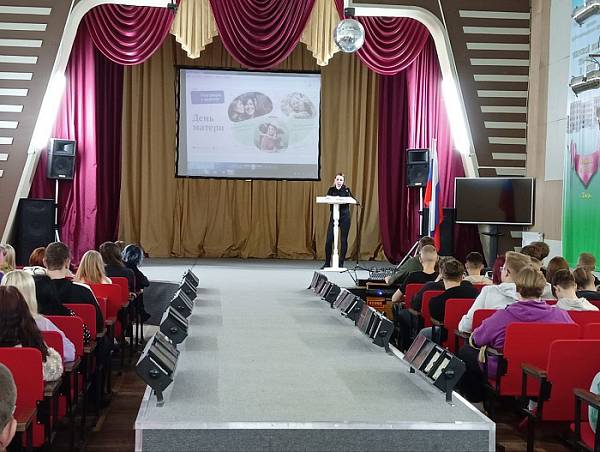 21 ноября 2022 года в рамках реализации проекта "Разговоры о важном" в колледже прошли беседы о роли матери в семье на основе равноправия членов семьи, равной ответственности, о воспитании любви и уважения к матери, стремления помогать и заботиться о ней. В этот раз мероприятие было приурочено к празднованию Дня матери, который ежегодно отмечается в последнее воскресенье ноября (27 ноября в этом году). Занятие уже по традиции началось с выноса флага РФ и исполнения гимна РФ.