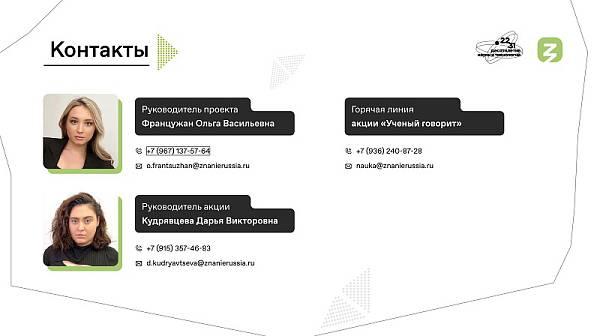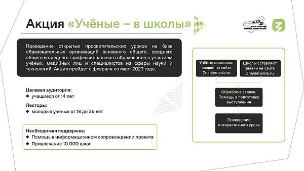 В 2023 году Российским обществом «Знание» совместно с Минпросвещения России запущена Всероссийская акция «Ученые – в школы» для молодых ученых и обучающихся общеобразовательных организаций. Акция направлена на поиск и отбор талантливых лекторов, в рамках которой любой желающий молодой научный деятель может попробовать свои силы в качестве лектора, совершенствовать навыки публичных выступлений, найти свою аудиторию.